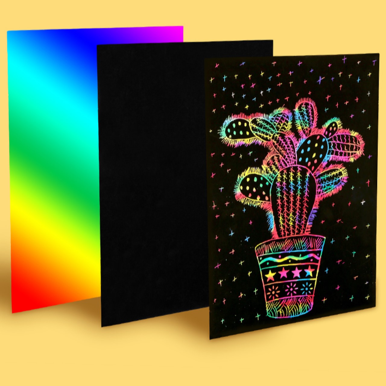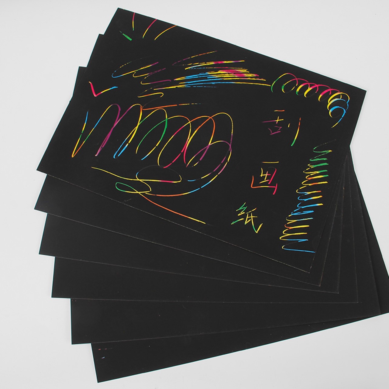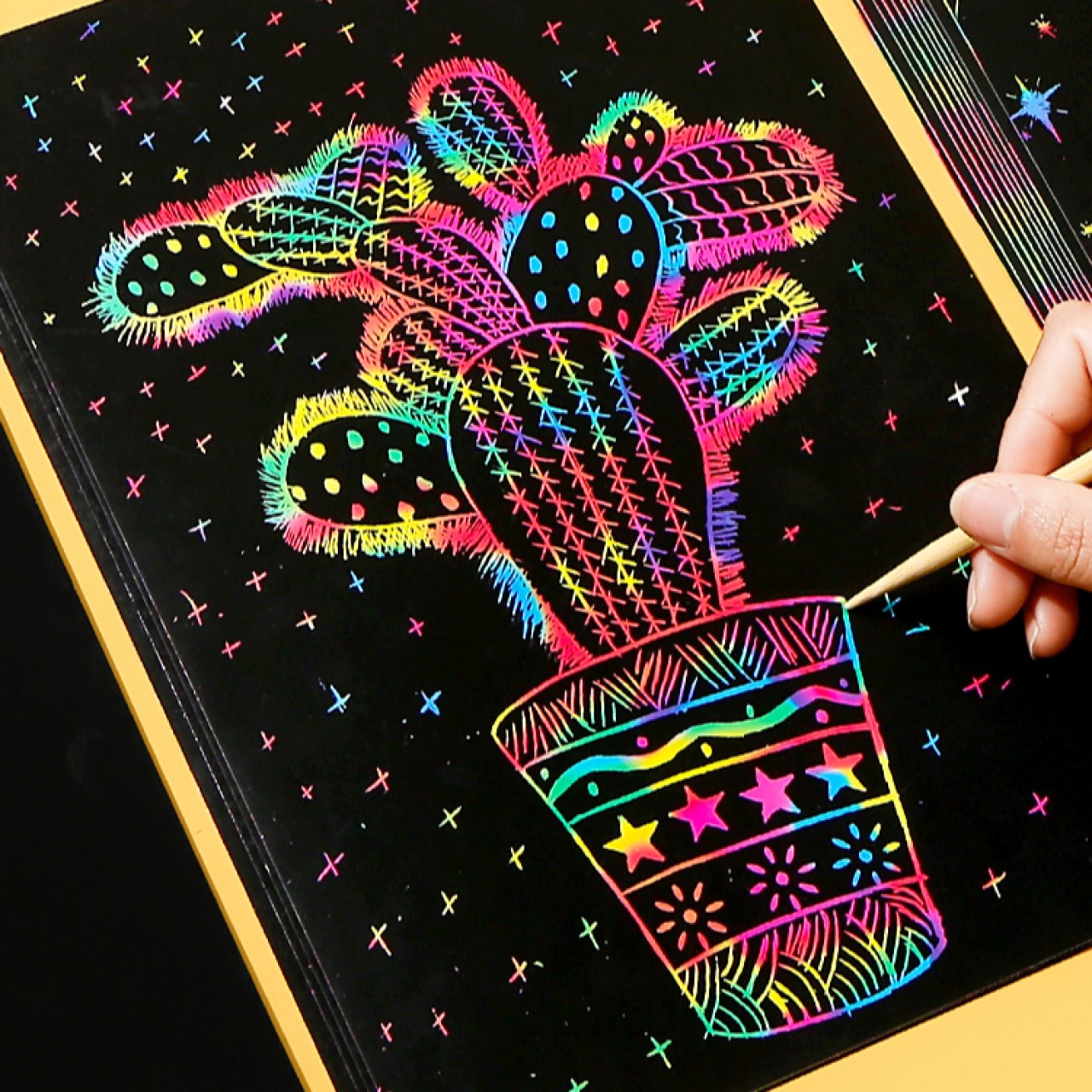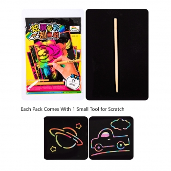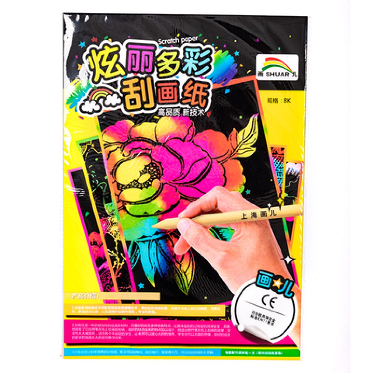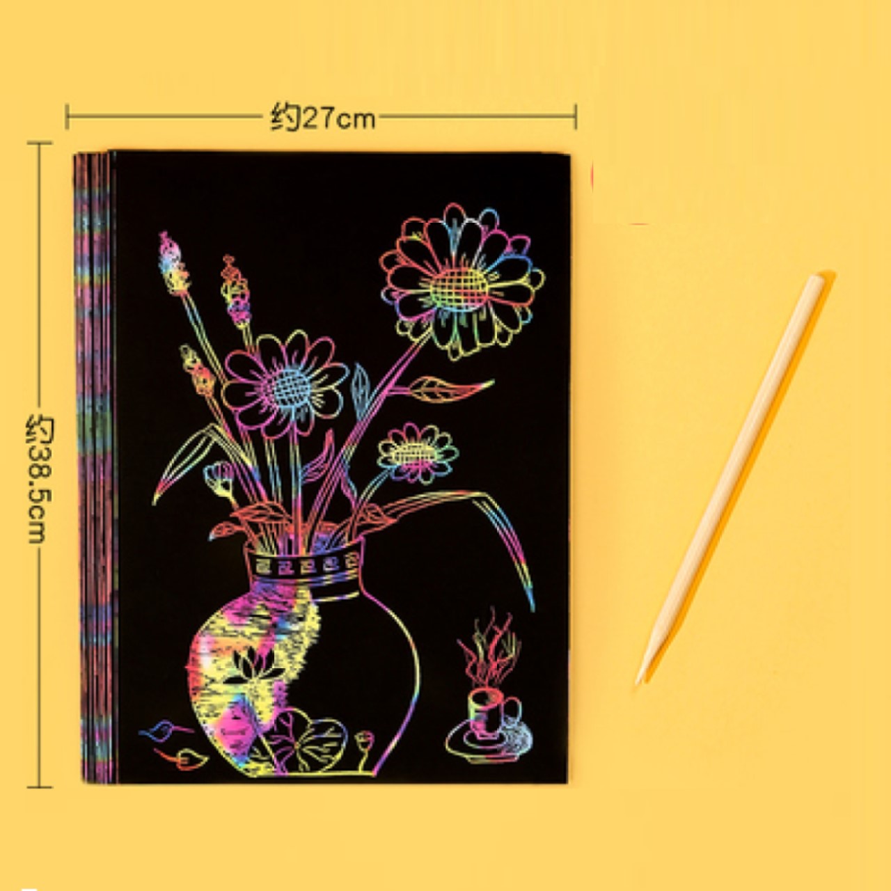 - ●Equipped with 1 wooden pen. Bright colors and patterns are hidden under the black matte coating. You and your child can use a wooden pen to scratch the surface of the drawing paper, and then you can see the colorful patterns.