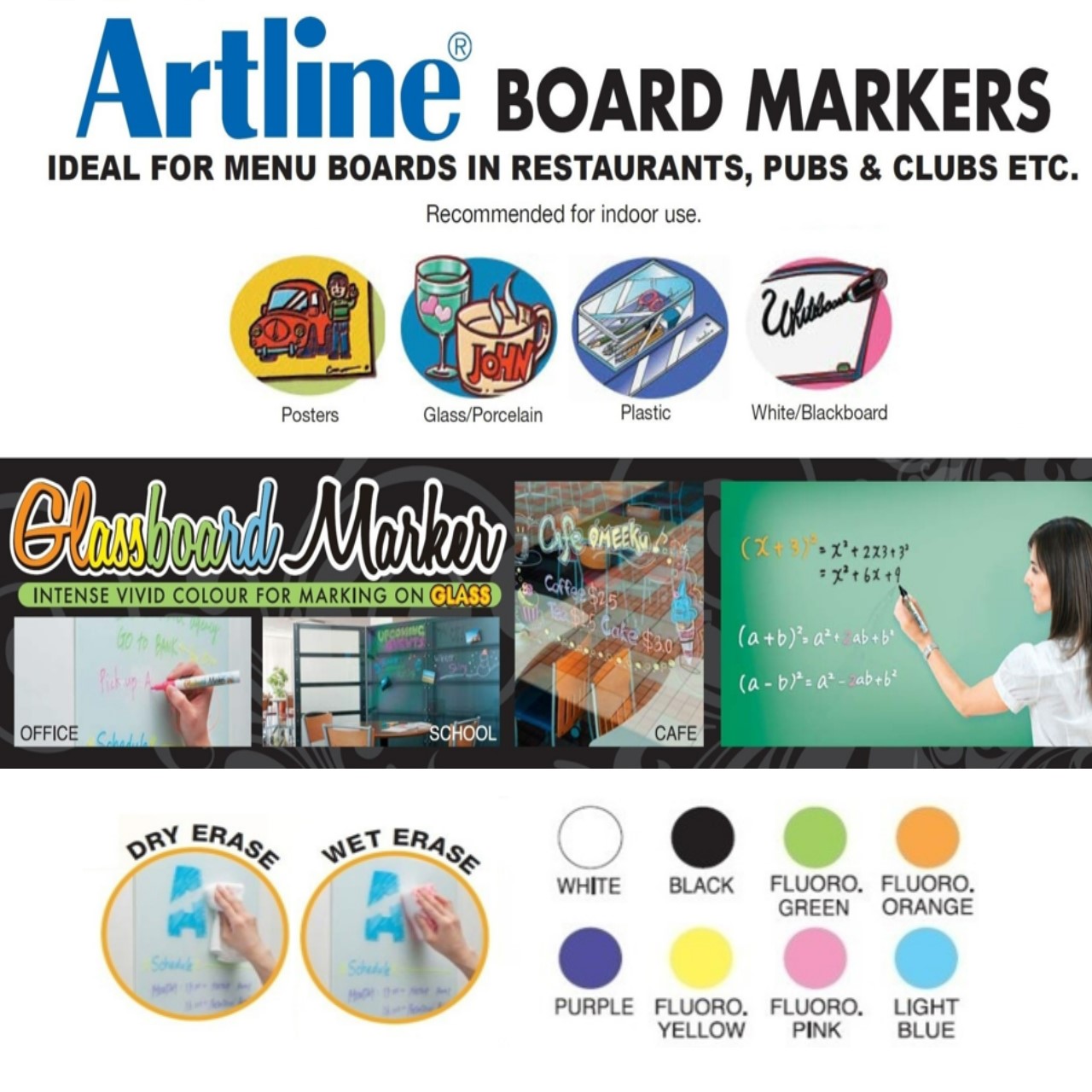 Intense vivid colour for marking on glass. Easily erasable with a dry-wipe or a water dampened wipe.