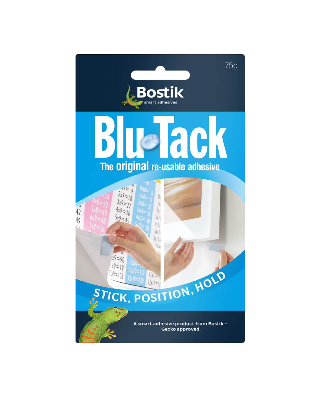 Blu Tack® is the original reusable adhesive that provides an ideal alternative to drawing pins and sticky tape, with thousands of uses around the home, office and school environment. It is a permanently plastic, reusable multipurpose adhesive and modelling material that is pliable and non-toxic, making it safe for all the family to mold, stick and play. It’s formula is a manufacturing secret, but Blu Tack it can be described as a synthetic rubber compound without hazardous properties (under normal conditions). It’s non-carcinogenic, non-soluble and is denser than water.