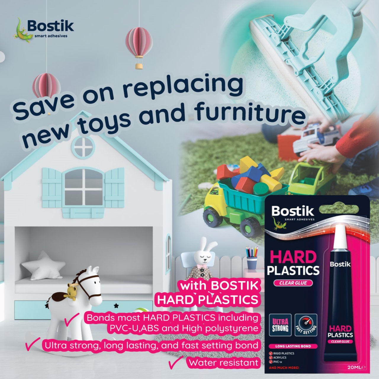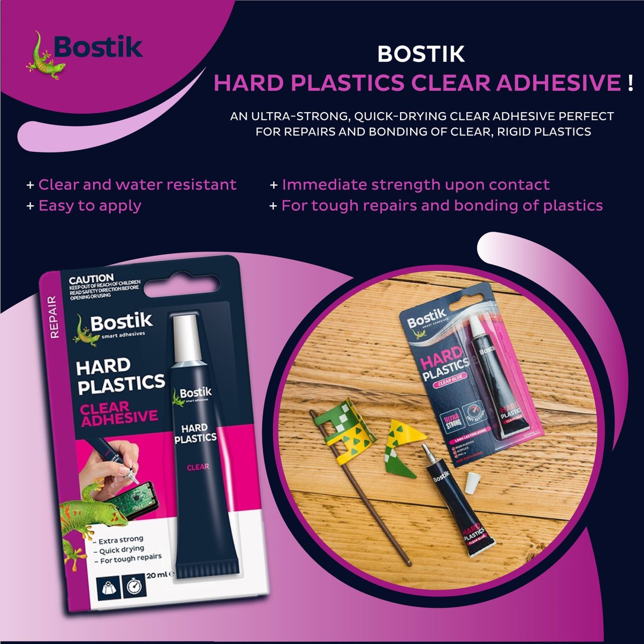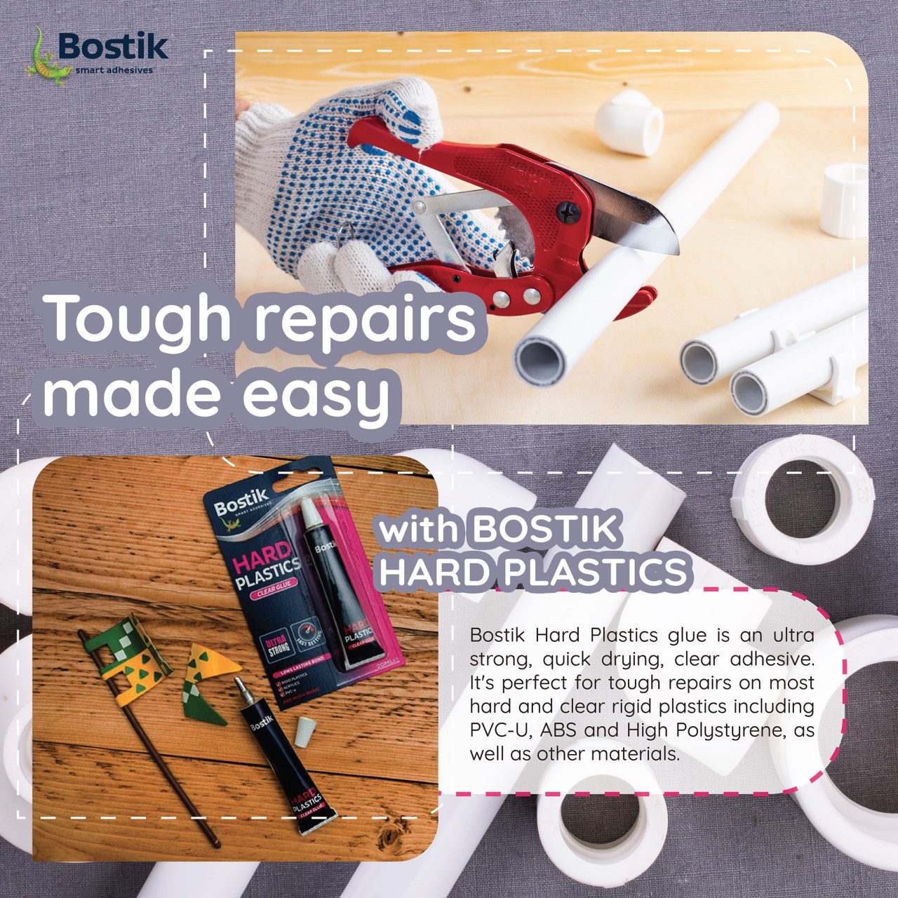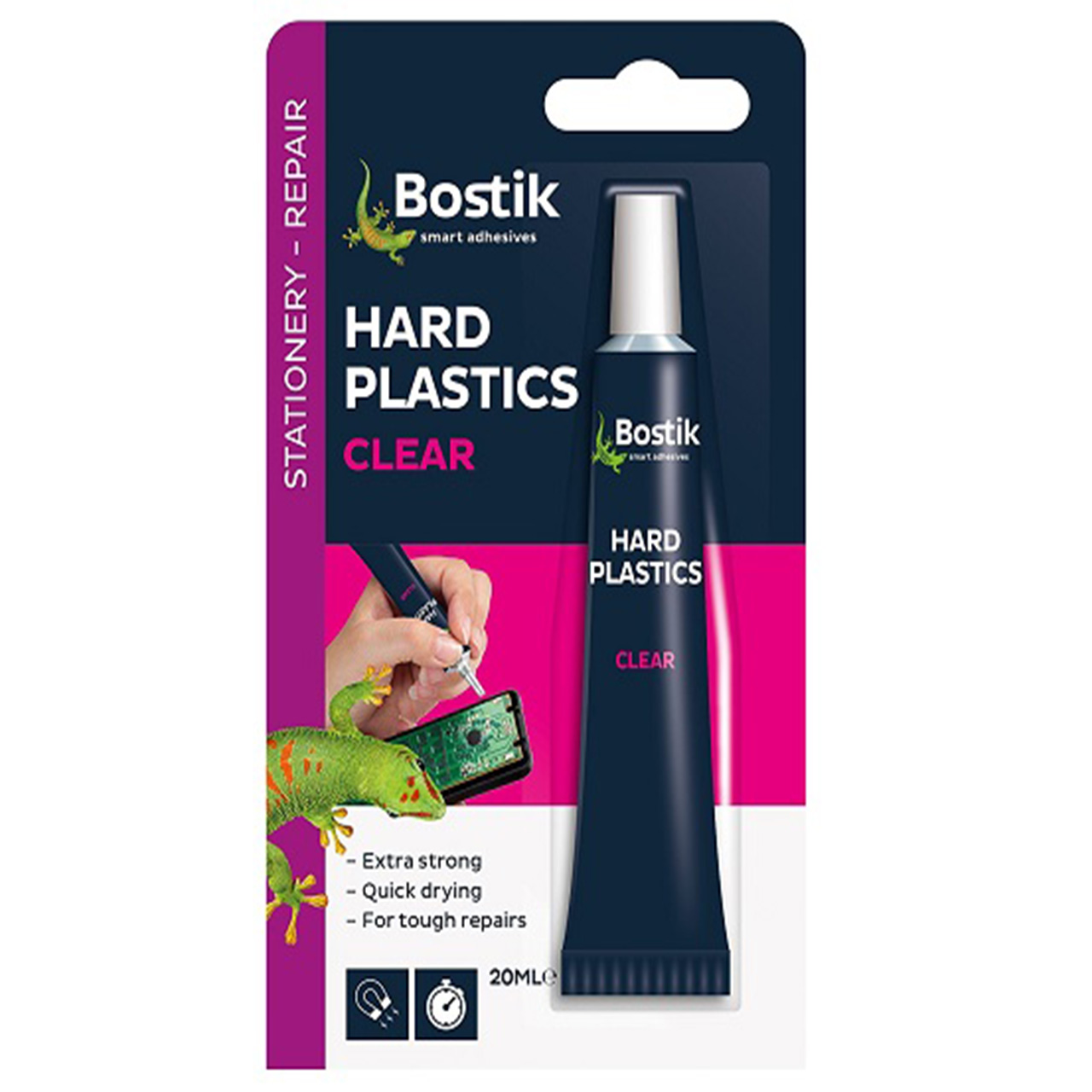 Bostik Hard Plastics glue is an ultra strong, quick drying, clear adhesive. It's perfect for tough repairs on most hard and clear rigid plastics including PVC-U, ABS and High Polystyrene, as well as other materials.