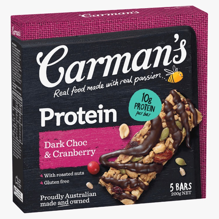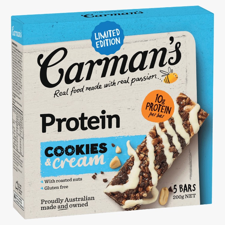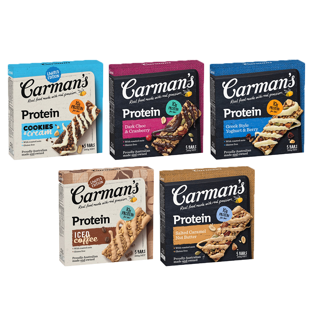 Carman'S Protein Bar (Assorted Flavours), 200G, 5 Bars Per Box Assorted Flavours Selection: Cookies & Cream, Dark Choc & Cranberry, Ice Coffee, Salted Caramel Nut Butter, Greek Style Yogurt & Berry