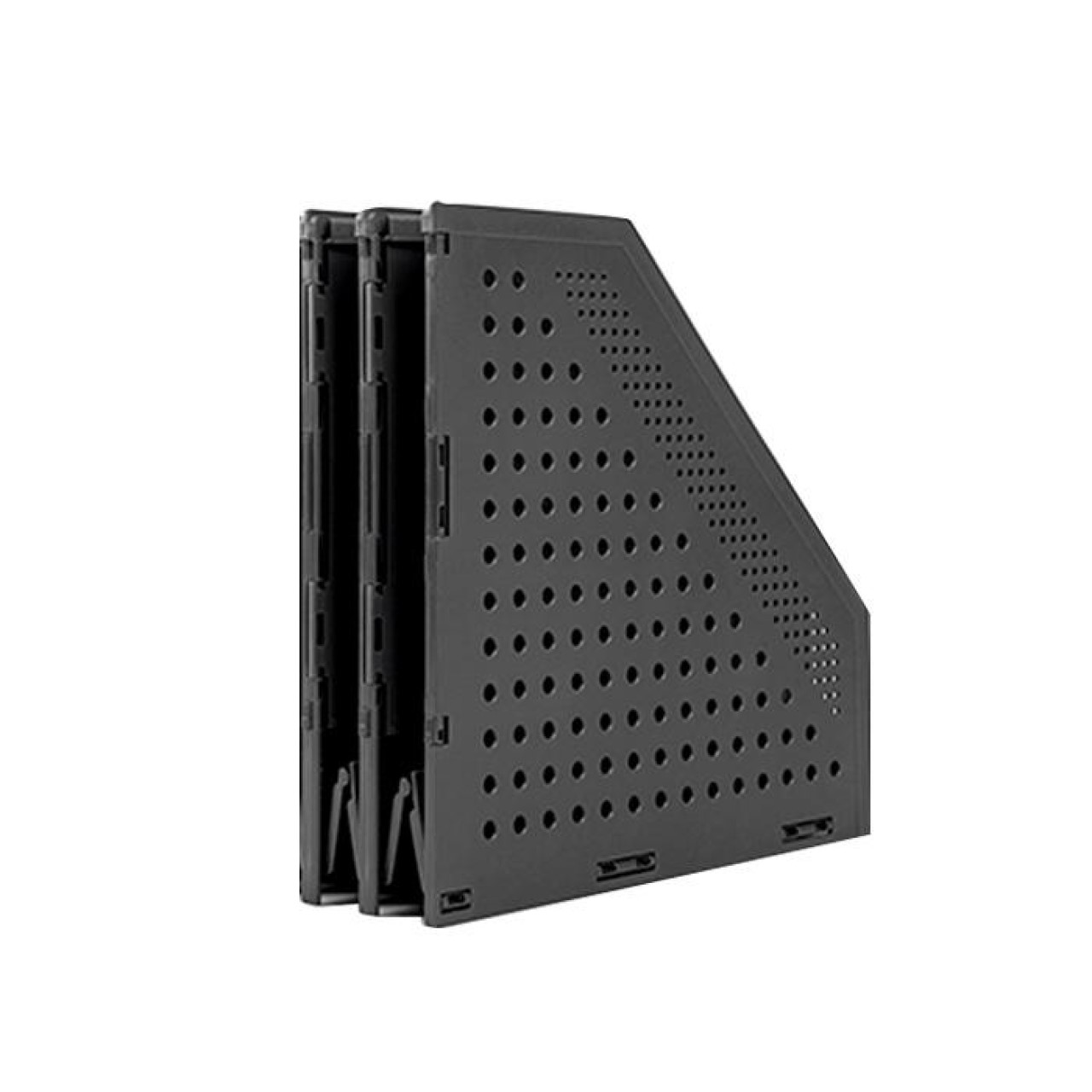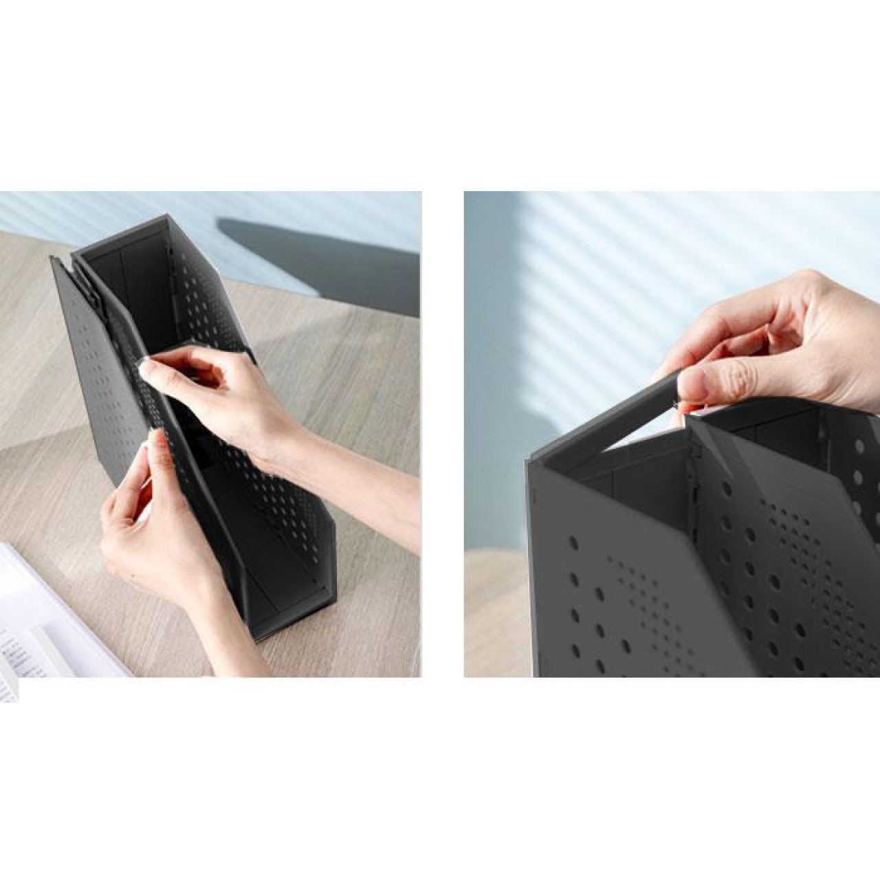 Collapsible Magazine Holder Desk comprised of 2 compartments, pull gently to fold or unfold.