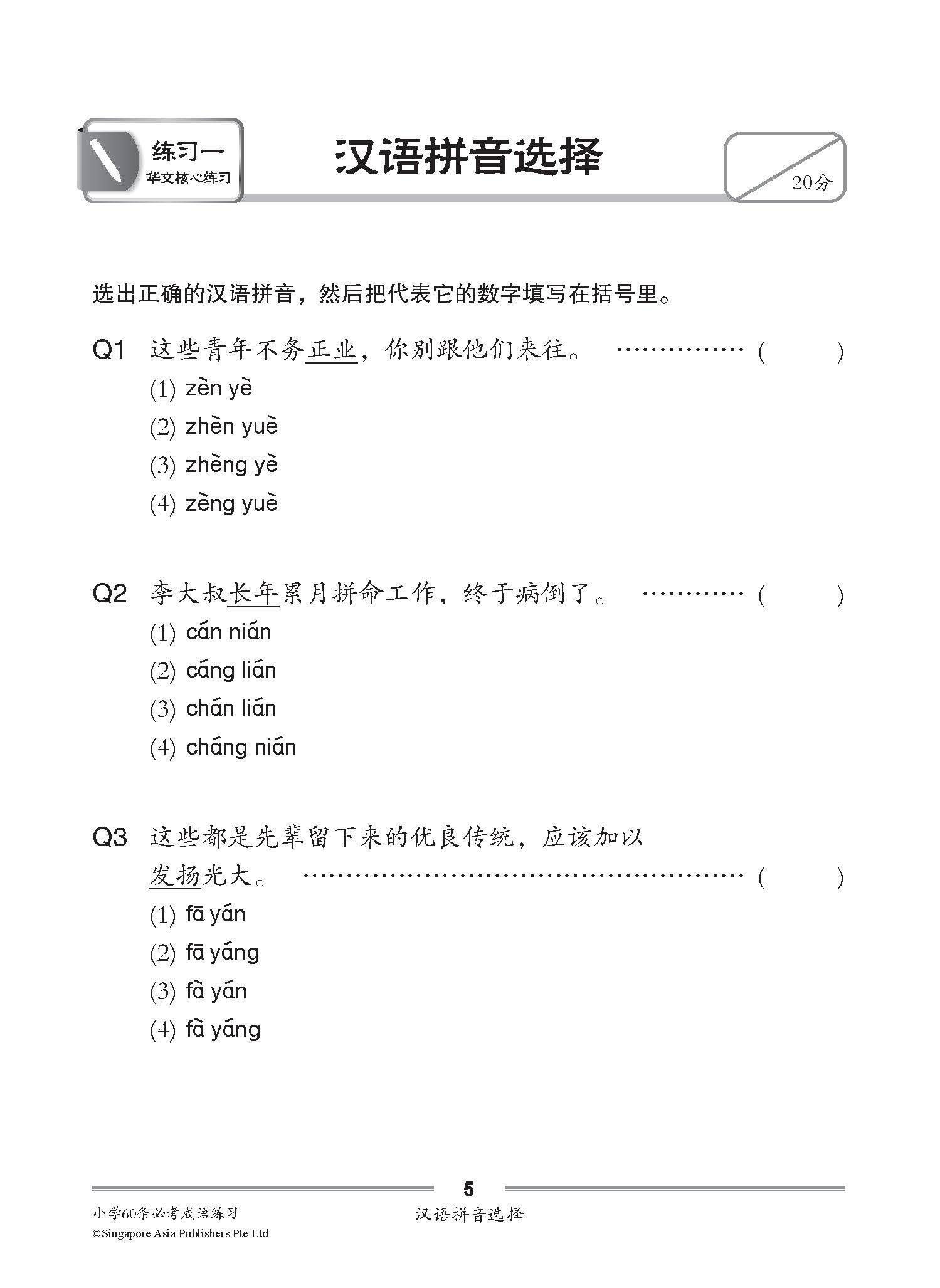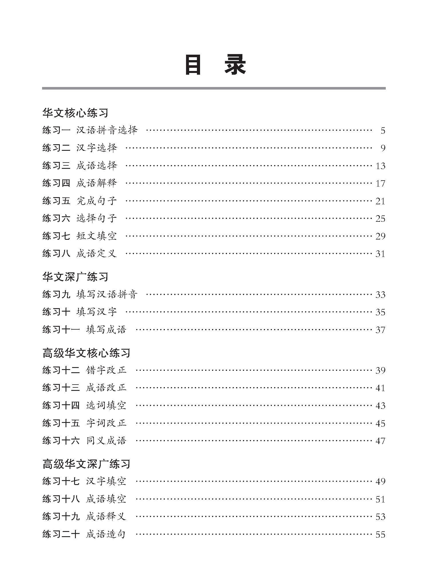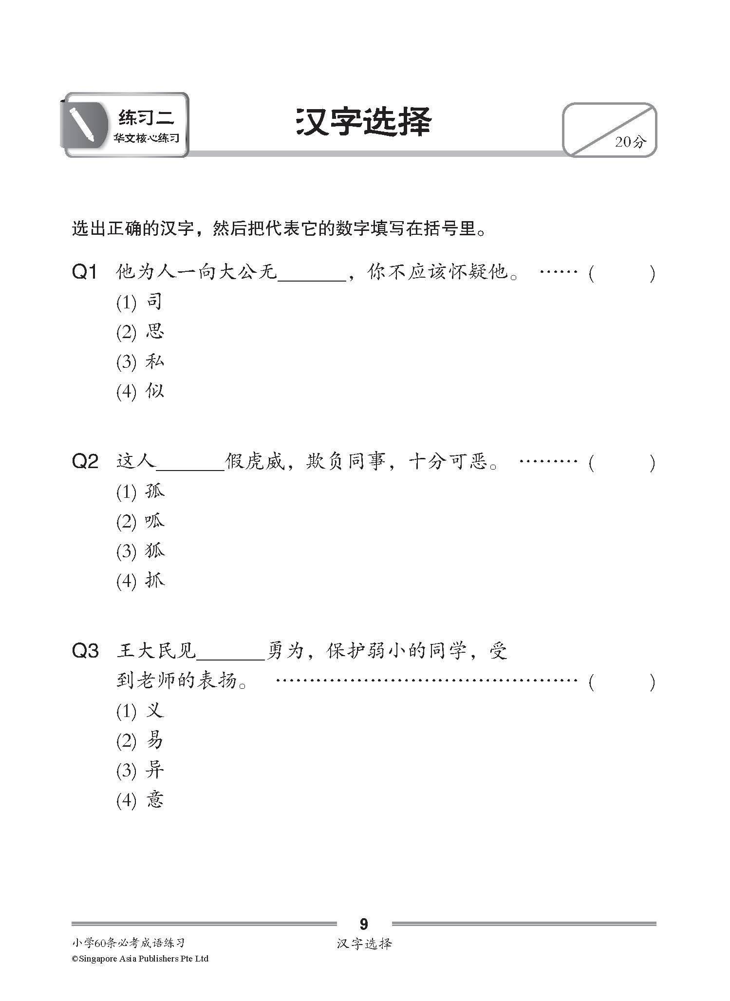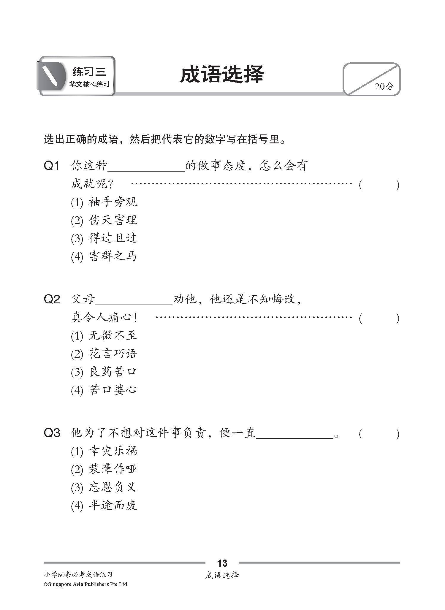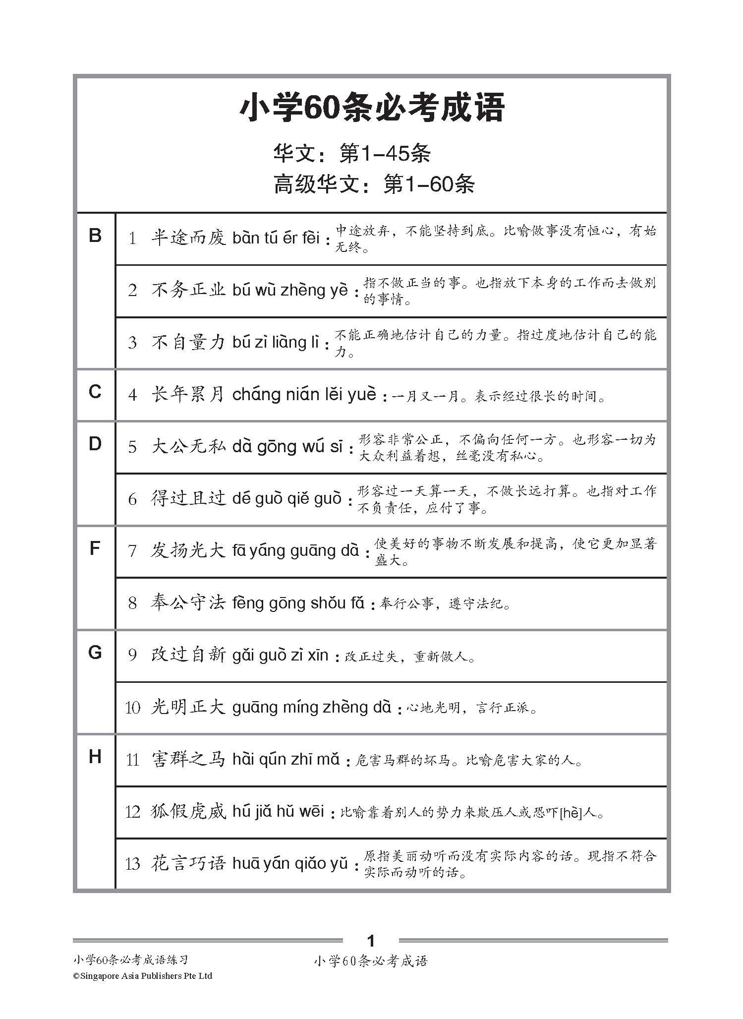 - 本书是根据教育部规定的(小学60条必考成语)精心编写的, 适合修读华文和高级华文的小学生使用.