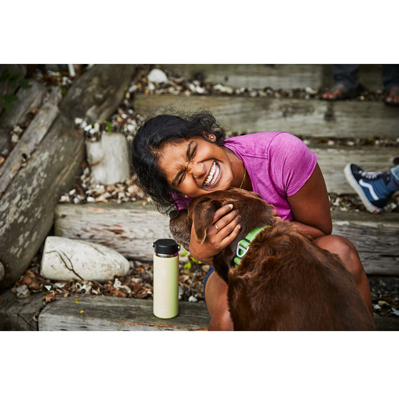 A new look for the new decade. Redesigned Wide Mouth Hydro Flasks feature sleek stainless steel collars, to match the look of the standard mouth necks. Don't be afraid to send your water bottle through the dishwasher, new Hydro Flask bottles are now dishwasher safe with the new powder coating. Take this insulated water bottle with you to the gym, the office, or in your camping gear, it'll keep cold liquids chilled for up to 24 hours and hot liquids hot for up to 12 hours. It's large enough to hold water for the day, yet it fits easily into a backpack or side pocket. This metal water bottle is made with 18/8 stainless steel to keep your favorite drinks from leaving any leftover flavors or odors. Wherever you take this stainless steel water bottle, count on Hydro Flask's Flex Lid to keep your contents safe from spills and leakage. The Flex Lid has a water bottle handle on it, so you can carry it easily with one hand. Count on Hydro Flask for hydration on any adventure. This leak-proof water bottle is backed by a manufacturer.