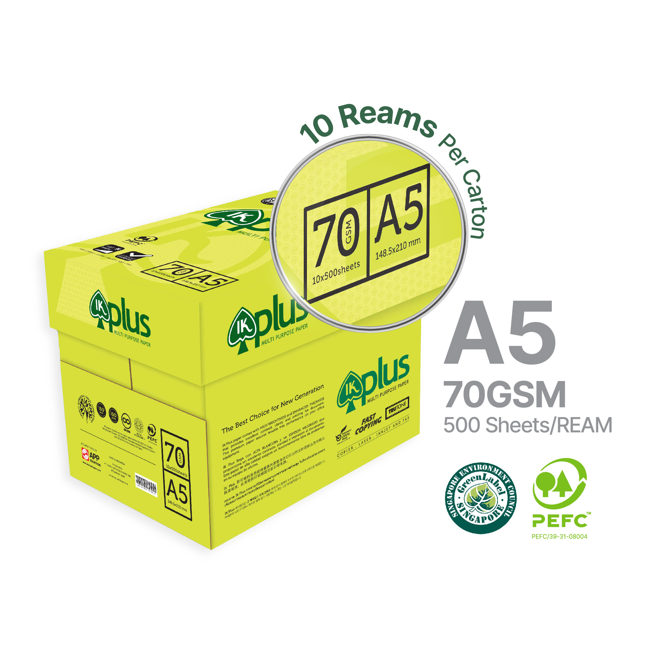 IK Plus Copier Paper A5 70gm Paper Thickness : 70gsm Packing : 500 Sheets / Ream 1Carton = 10 Reams