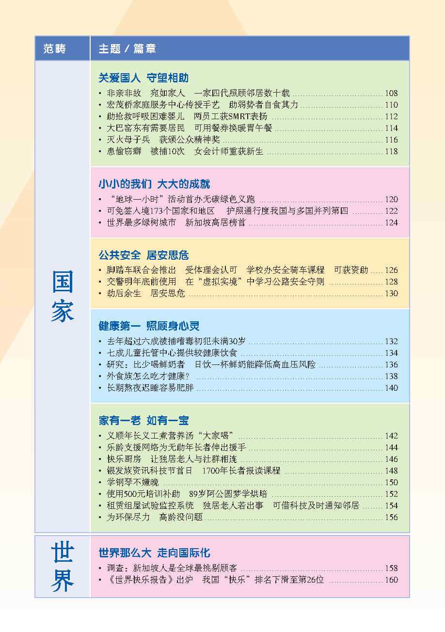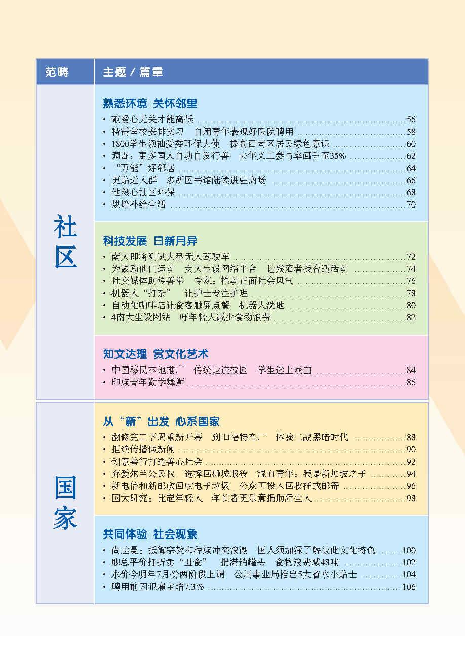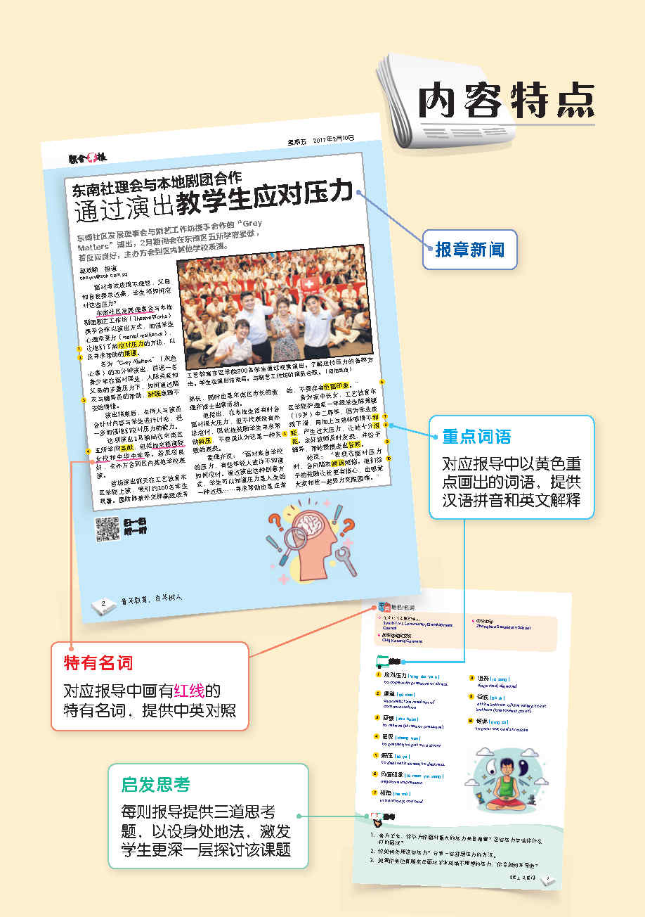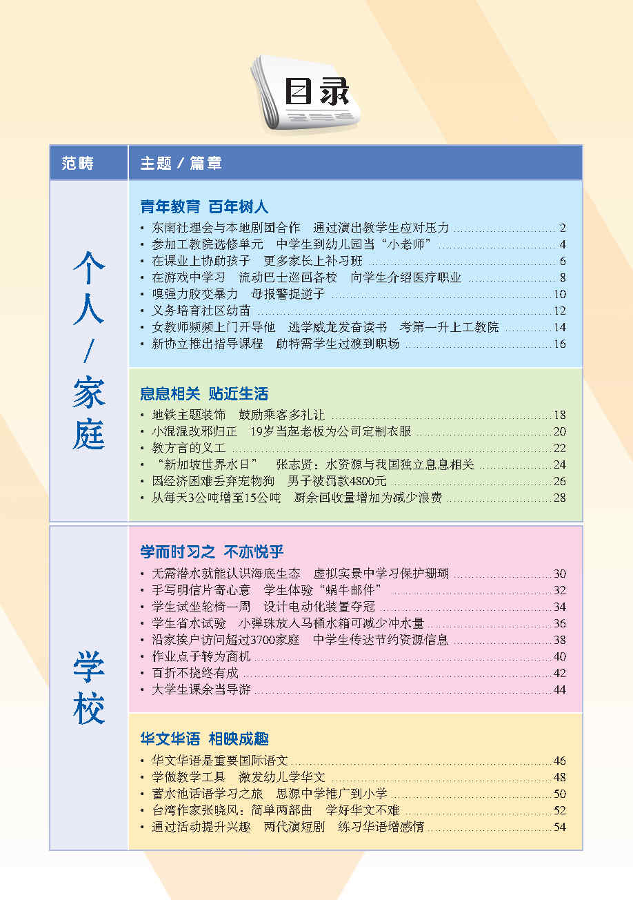编辑团队根据教育部华文课程大纲里出的六大范畴(个人, 家庭, 学校, 社区, 国家和世界), 外加额外范畴 - 知识点, 再以每个范畴为中心, 选出相关报章内容. 这些新闻皆是近年或时下热门话题, 可以延伸为课堂讨论话题, 帮助学生进行深度思考和讨论.