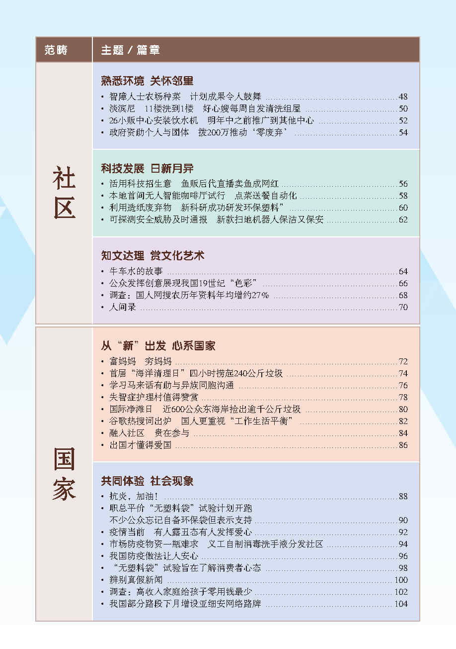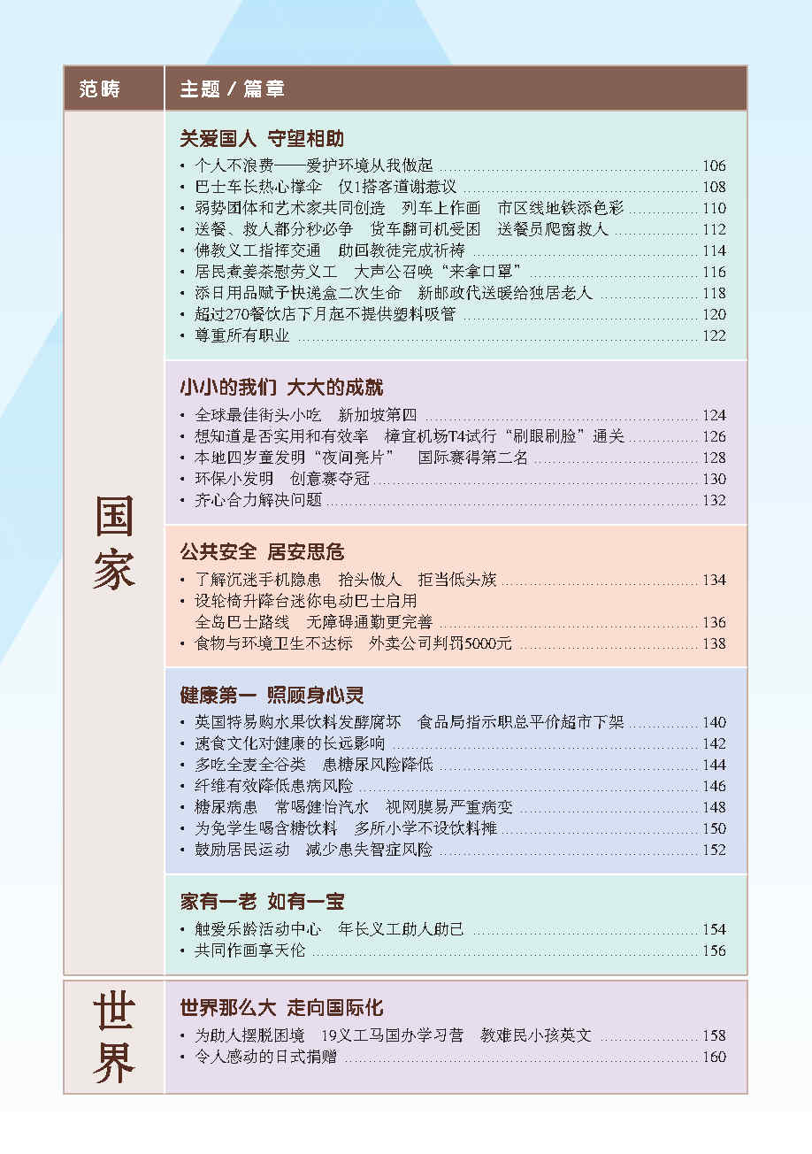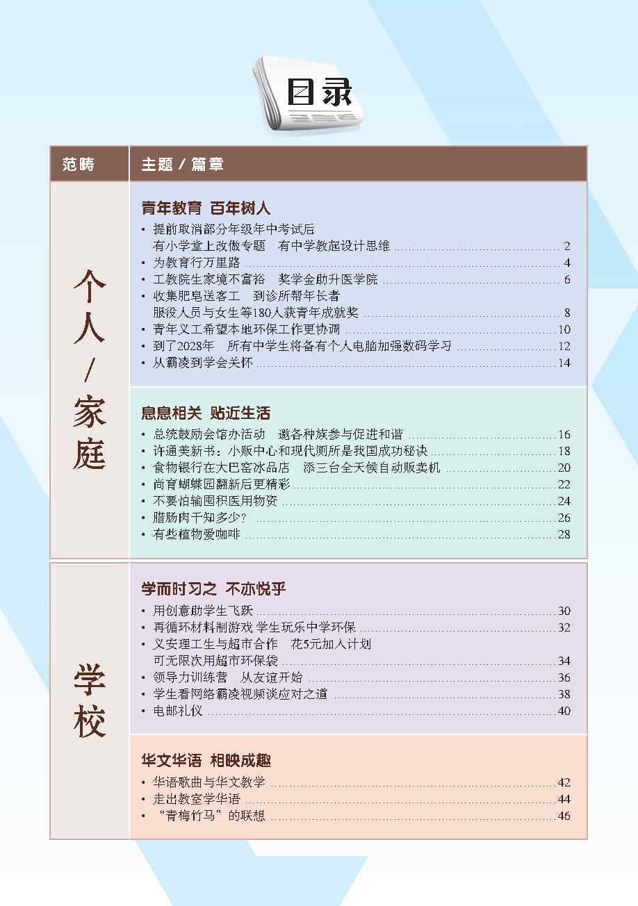 编辑团队根据教育部华文课程大纲里出的六大范畴(个人, 家庭, 学校, 社区, 国家和世界), 外加额外范畴 - 知识点, 再以每个范畴为中心, 选出相关报章内容. 这些新闻皆是近年或时下热门话题, 可以延伸为课堂讨论话题, 帮助学生进行深度思考和讨论.