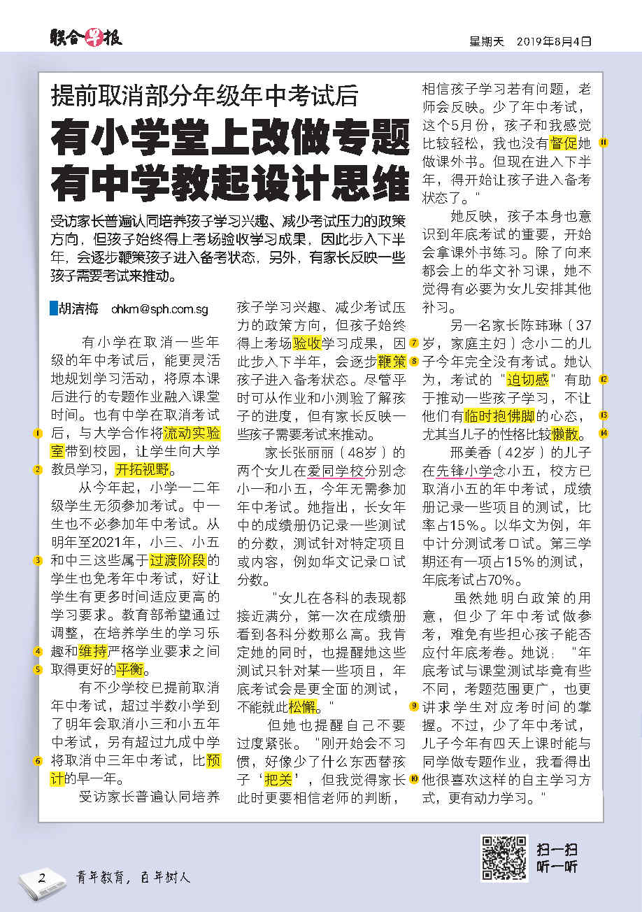 每则新闻附有语音导读, 学生只要扫描QR码就能边看边听新闻.