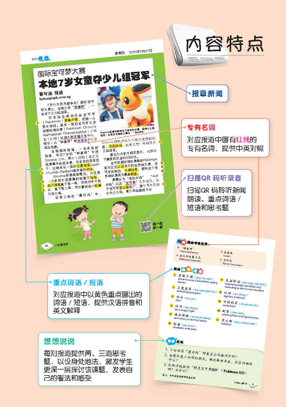 Junior is a carefully curated series of newspaper articles sourced from Lianhe Zaobao, Lianhe Wanbao and Shin Ming Daily News. Each book contains 45 selected articles that are suitable for primary students’ daily reading, and each article is paired with vocabulary learning and questions to stimulate deeper understanding of the topic.