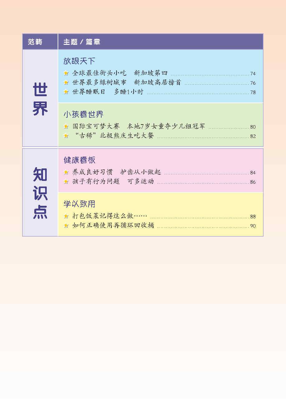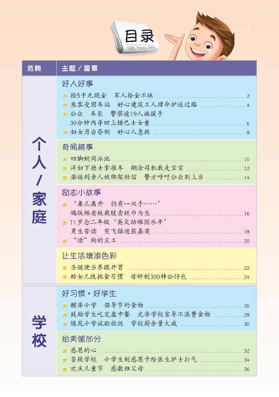编辑团队根据教育部华文课程大纲里出的六大范畴(个人, 家庭, 学校, 社区, 国家和世界), 外加额外范畴 - 知识点, 再以每个范畴为中心, 选出相关报章内容. 这些新闻皆是近年或时下热门话题, 可以延伸为课堂讨论话题, 帮助学生进行深度思考和讨论.