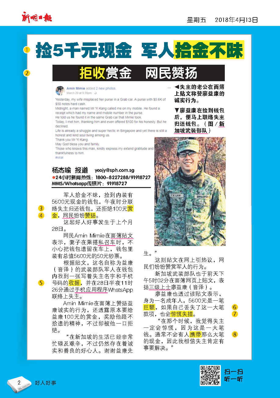 每则新闻附有语音导读, 学生只要扫描QR码就能边看边听新闻.