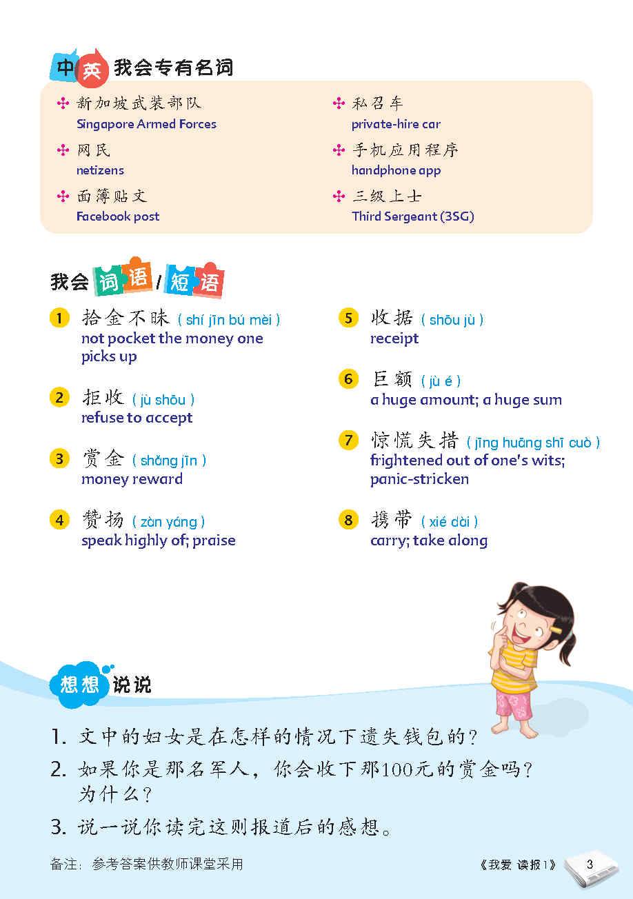 看报可以让我们知道天下大小事, 除了丰富知识, 还能提升语文水平.《我爱读报》是一本精选本地三大报章《联合早报》,《联合晚报》,《新明日报》富趣味性和可读性的新闻, 让学生在轻松的心态下阅读, 通过《我爱读报》,加强听力与写作能力.