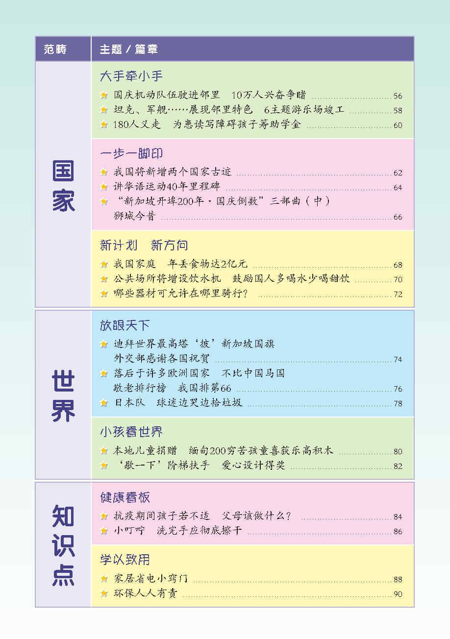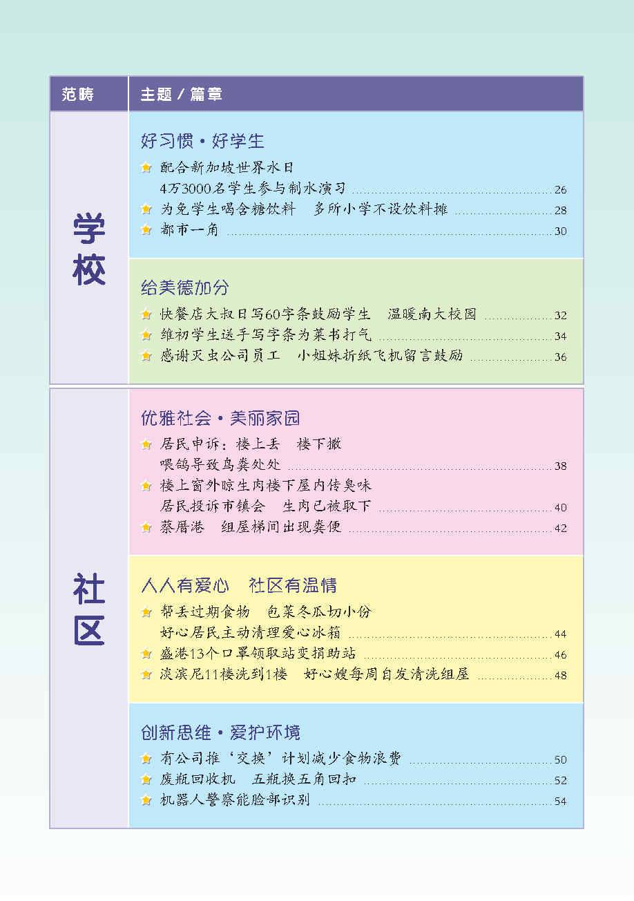 编辑团队根据教育部华文课程大纲里出的六大范畴(个人, 家庭, 学校, 社区, 国家和世界), 外加额外范畴 - 知识点, 再以每个范畴为中心, 选出相关报章内容. 这些新闻皆是近年或时下热门话题, 可以延伸为课堂讨论话题, 帮助学生进行深度思考和讨论.