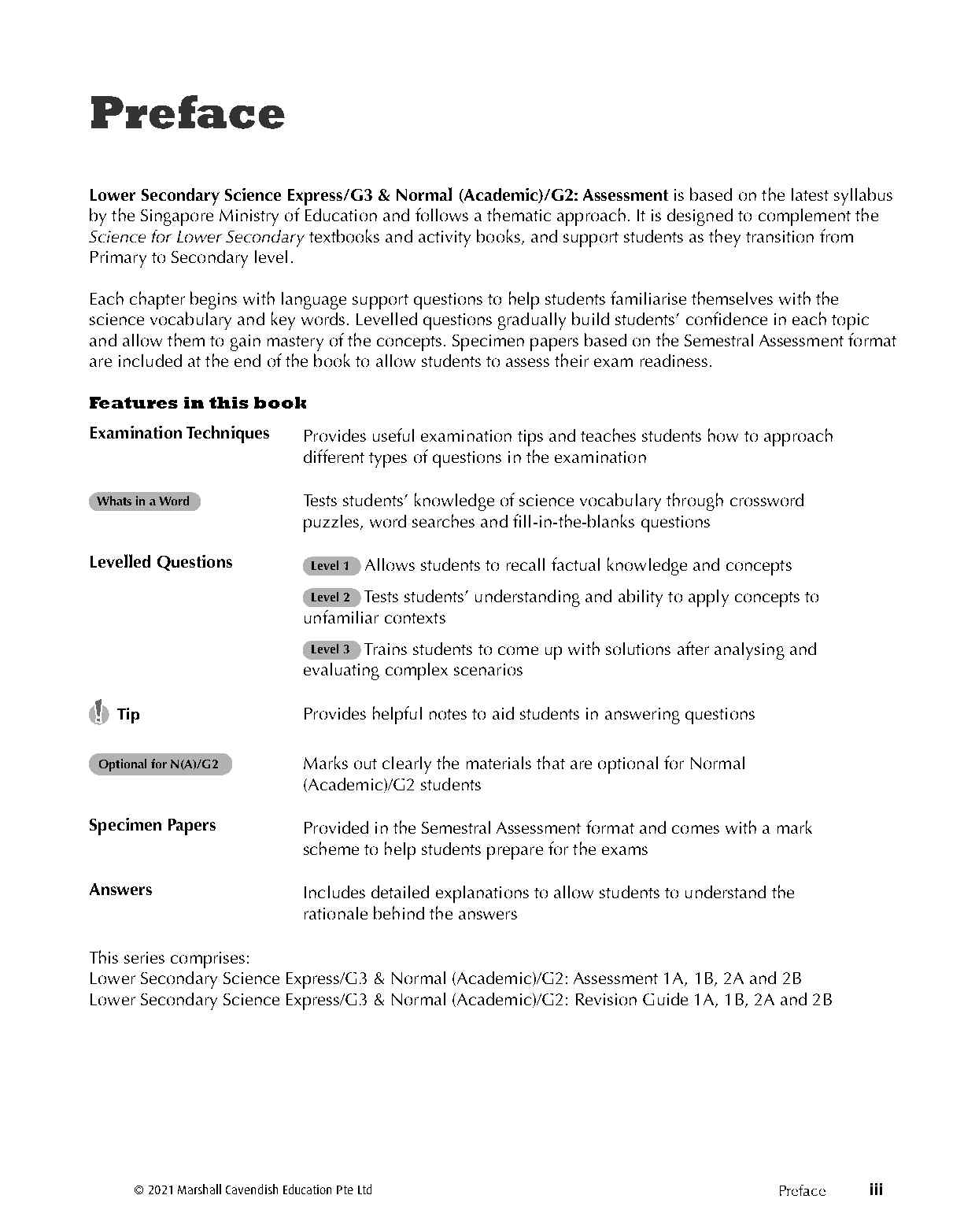 The ''Lower Secondary Science Express/Normal (Academic) Assessment'' series is intended to fully support students through the transition from Upper Primary to Lower Secondary. Each chapter begins with language support questions to help students come to grips with the vocabulary needed to score well in tests. Levelled questions for each chapter gradually builds exam-confidence on individual topics. Finally, Specimen papers with mark schemes based on the Semestral Assessment format allow students to assess their readiness for the exam.
