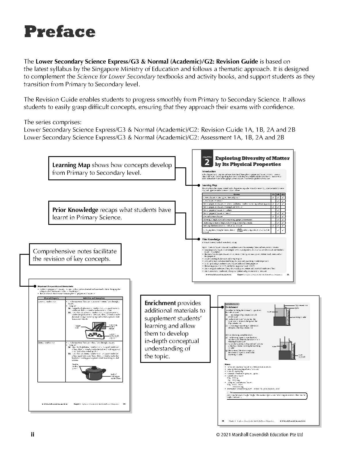 The ''Lower Secondary Science Express/Normal (Academic) Assessment'' series is intended to fully support students through the transition from Upper Primary to Lower Secondary. Each chapter begins with language support questions to help students come to grips with the vocabulary needed to score well in tests. Levelled questions for each chapter gradually builds exam-confidence on individual topics. Finally, Specimen papers with mark schemes based on the Semestral Assessment format allow students to assess their readiness for the exam.