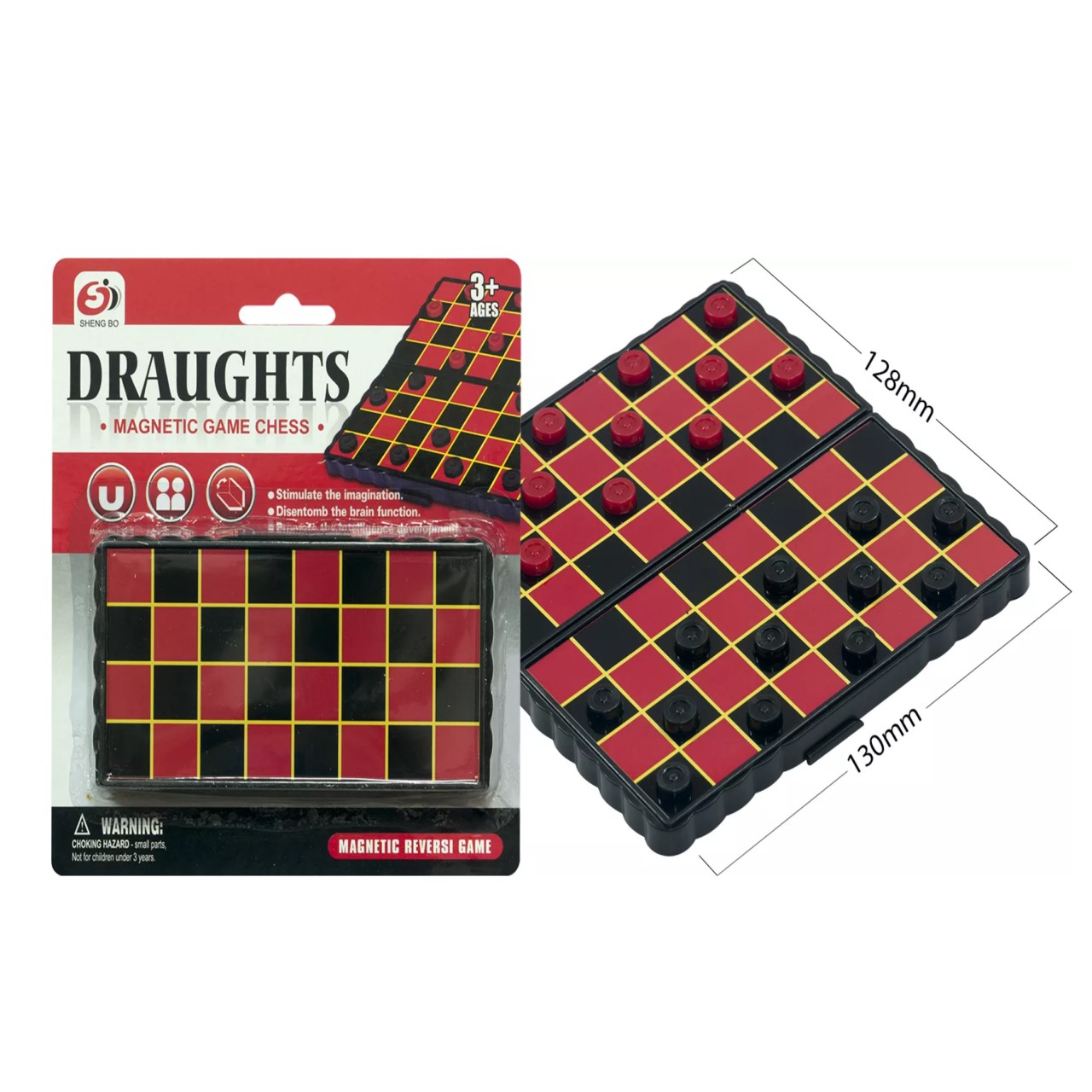 This is one of the oldest types of chest set available to children and adults. It is called Draughts and it is all contained in a plastic box which also acts as a magnetic chess board when open up fully. The 2 opposing sides have black and red checkers and they are all magnetic which will stick to the checkers board when place.
