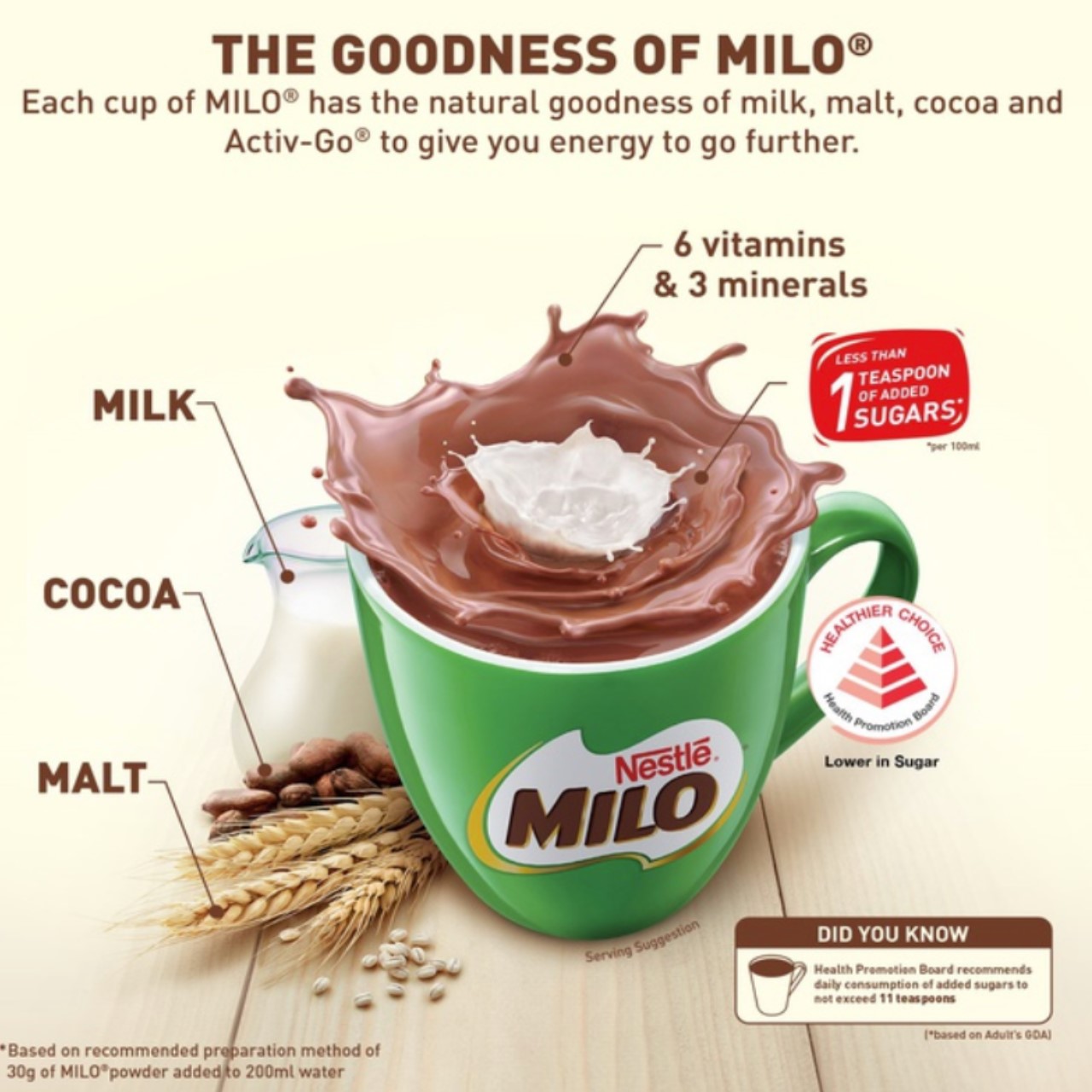 - 3 servings of Milo (yielding at least 300kcal) help meet your daily energy requirements