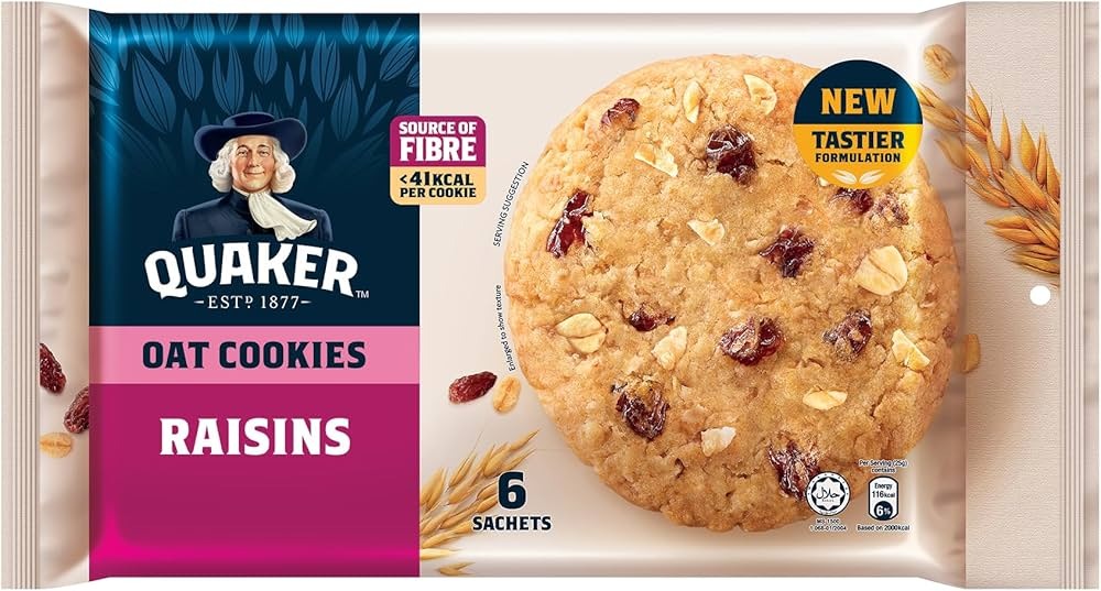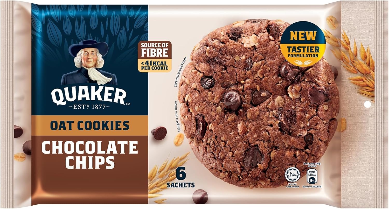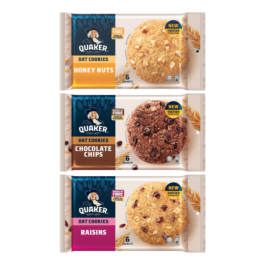 Quaker Oats Cookies (Assorted Flavours), 150G, 6 Sachets Per Pack Assorted Flavours Selection: Chocolate Chips, Honey Nuts, Raisins