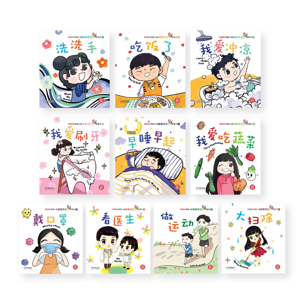 - 洗洗手, 吃饭了, 我爱冲凉, 我爱刷牙, 早睡早起, 我爱吃蔬菜, 戴口罩, 看医生, 做运动, 大扫除